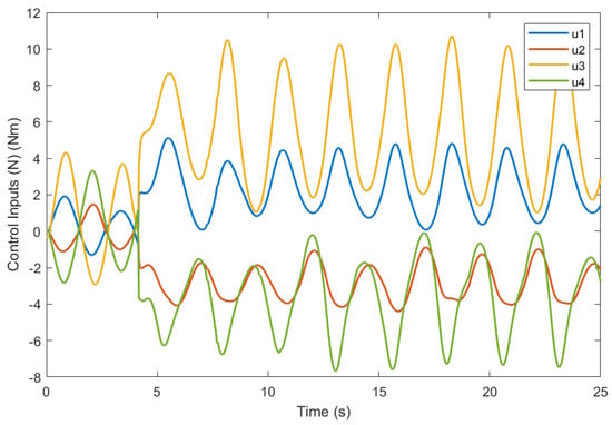 Control inputs of the proposed DOBMPC in surge, sway, heave, and yaw direction for tracking circular trajectory under constant currents.