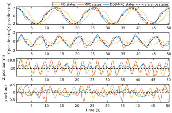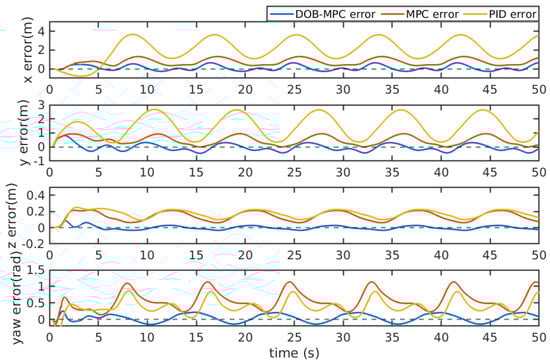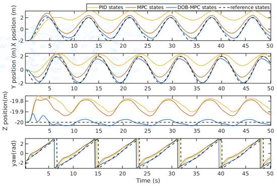 Circular trajectory tracking results of the proposed DOBMPC, baseline MPC, and PID controllers in x, y, z, and yaw directions.