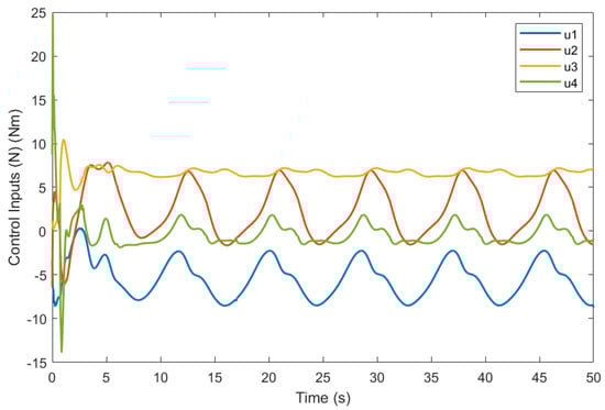 Control inputs of the proposed DOBMPC in surge, sway, heave, and yaw direction for tracking lemniscate trajectory under periodic waves.