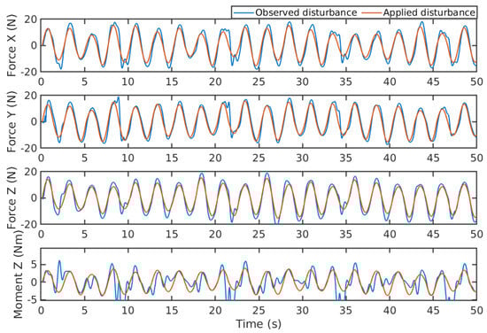 The above figures demonstrate that the proposed observer can accurately estimate disturbances of both periodic wave effects and constant current effects. The observer also shows the ability to capture the unmodeled dynamics. However, it can be observed that when the frequency of periodic wave effects is too high, the observer may lose the accuracy of estimating disturbances. This is because the disturbance term is assumed to be a slow time-varying signal.