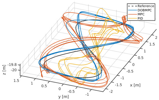 Three-dimensional lemniscate trajectory tracking results of the proposed DOBMPC, baseline MPC, and PID controllers.