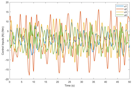 Control inputs of the proposed DOBMPC in surge, sway, heave, and yaw direction for dynamic positioning under superposition of periodic wave and constant current effect.