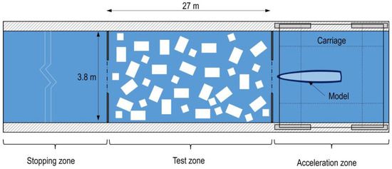 In this section, the methodology that was followed to conduct the tests is described. An introduction to it was given by Gutierrez-Romero et al. [6]. They performed experimental tests to estimate the influence of blocks floating on the free surface on the ship’s resistance to motion. For this, they simulated the effect of broken ice (managed ice) in traditional towing tanks [6]. In addition, towed self-propulsion tests were also proposed to analyze the effect of these blocks on ship propulsion. The test methodology and observations are further described below.
