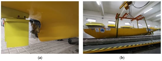 Figure 16 shows the process in which a block collides with one of the rudders of the ship model during a test. To avoid engine overloading due to torque because one of the blocks intercepts the propeller, the propulsion system was stopped any time that a block was in the vicinity of the propeller. This procedure avoided the breaking of the propulsion system through real-time continuous monitoring of the aft of the ship model with underwater cameras. Since the propeller was stopped and the model lost its propulsion speed, the model was held together with the carriage with a gripper to avoid hitting the carriage. When the danger was over, the propeller was set at the proper speed again and the ship model was free to advance, restarting the test.