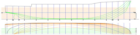 The tested model is based on the Spanish Army’s Research Vessel Hespérides [37]. This vessel has two rudders installed (see Figure 2a) and a compromise bow that allows navigation under mild ice conditions. The main features of the full-scale vessel are shown in Table 1. As was pointed out in a previous work [6], the model scale was restricted to the thickness of the artificial floating ice blocks. The scale used for the tests either for the model or for the propeller is 1:21.43. Figure 2b shows the model built for the tests, while Figure 3 shows the plan of the hull lines for the selected vessel. The model scale was selected according to two main reasons: to reduce scale effects by building a model as large as possible, and the thickness of the simulated floes. In the last case, the average manufacturing thickness of the blocks was 39.3 mm [6]. Considering the class rules [38,39] for the construction of polar ships, a typical ice flow thickness of 840 mm was considered for the full-scale vessel. This ratio, along with the previous one, determined the scale of the tested model.