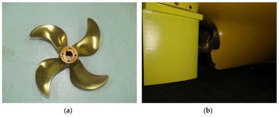 To perform towed self-propulsion tests, a four-blade propeller has been used (see Figure 4), whose features are shown in Table 2. This propeller is similar to the one installed on the full-scale ship [37].