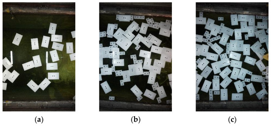 The free surface block distribution for each test was randomly chosen to obtain a distribution that was as homogeneous as possible in the testing zone. Figure 5a–c shows examples of each of the three tested coverages.