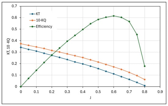 Obtained values of thrust and torque coefficients (KT, KQ), and propeller open water efficiency (η0), as a function of the advance coefficient (J).