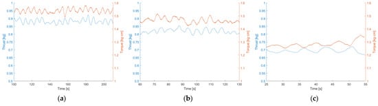 Table 7, Table 8 and Table 9 show the statistical data of thrust and torque for each performed test. The root mean square (RMS) and random uncertainty (U) are shown. Random uncertainty values were obtained following ITTC procedures [40], and signal segmentation and the Chauvenet criterion were used to eliminate outliers from the raw data. Figure 7 compares the thrust and torque time signals at different speeds with the same coverage. The shown signals were filtered with a moving average. Data related to the bias uncertainty can be found in [44].