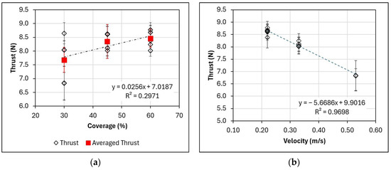 (a) Thrust versus percentage of block coverage. Thrust mean values are represented by the red squares, while the black hollow diamonds represent individual tests; (b) Mean thrust versus model speed.