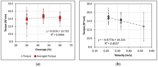 (a) Mean torque over coverage percentage. Mean torque values are represented by the red squares, while individual tests are represented by the black hollow diamond markers. (b) Mean torque versus model speed.