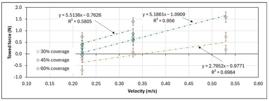 From the results previously shown, it is noticed that a decrease in thrust and torque occurs as speed increases, and there is a high correlation between thrust and torque. In Figure 12, it is shown that a high towing force is required, which increases as speed and coverage grow.
