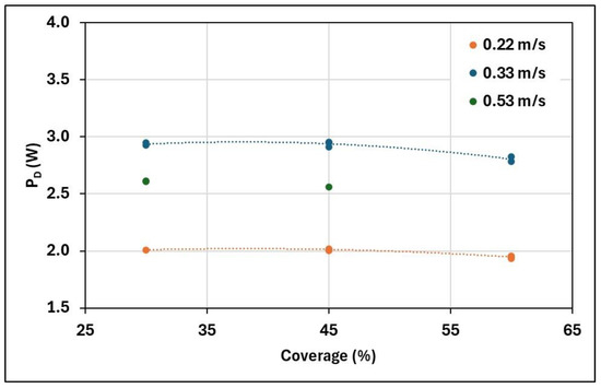 From Figure 13, a decrease in PD is observed as the percentage of coverage increases at different speeds. The propeller revolutions by speed and advance number are 2.12, 3.26, and 5.32 r.p.s., respectively.