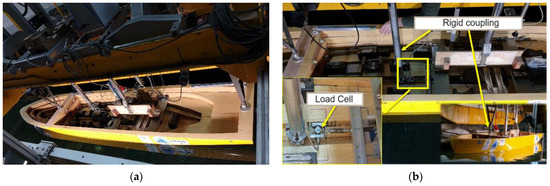 It must be noted that in traditional towing tanks, it is a common practice to install a calibrated spring that acts as a physical signal filter for measuring the ship’s resistance to motion (see Figure 14a). However, the tests presented in this paper with blocks floating on the free surface did not allow the aforementioned configuration of the spring, since the higher magnitude orders of the measured values of total ship resistance make it inappropriate.