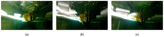 Sequence of a block colliding with one of the rudders during a test. (a) Block near the port side of the model. (b) Block under the model’s hull on the port side. (c) Block colliding with port rudder of the model.