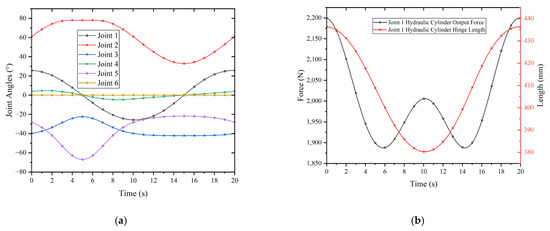 Figure 8 shows that before optimization, the maximum output force for driving the main-arm rotary joint (Joint 1) was = 8330 N with an output force fluctuation amplitude of = 6228 N. After optimization, the maximum driving force was reduced to 4714 N, a decrease of 43.4%, and the output force fluctuation amplitude was reduced to 2471 N, a decrease of 60.3%.