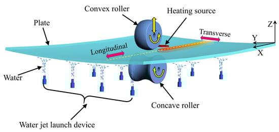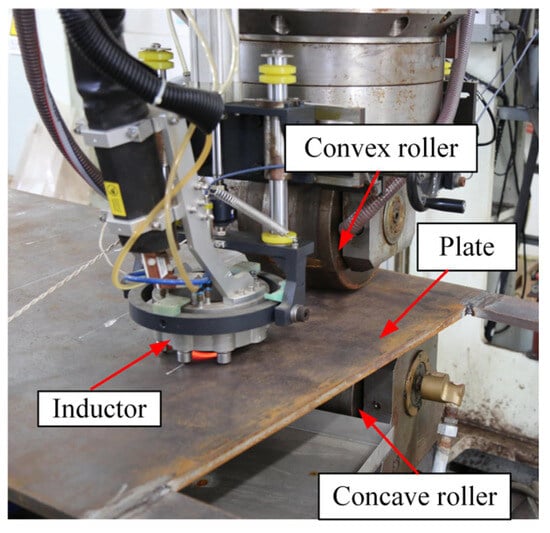 This section reviews the basic components of the IHMRF process. Figure 1 shows a schematic diagram of the IHMRF process’s basic components, with induction heating selected as the heat source in this study. IHMRF is a line loading process in which the loading tool does not move while the plate moves. During this process, the rollers both drive the plate in a specified direction through friction and can apply out-of-plane strains. At the same time, the heat source is located at a fixed distance from the rollers to heat the plate, mainly applying in-plane strains.