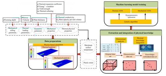 Data-driven modeling methods based on neural networks have received increasing attention in smart manufacturing research [11]. Traditional neural network model training methods start directly from the data and extract data features by passing data between multiple hidden layers to automatically learn and infer relationships between variables. However, due to the characteristics of the IHMRF process, the number of variables involved in the forming parameters is large, especially since different materials have different temperature-dependent material properties. If the forming parameters are directly used as input features, traditional training methods may not be able to extract enough information from the complex multidimensional data, resulting in inaccurate predictions when the samples are small, and it is difficult to ensure the generalization ability of the model. However, for IHMRF, it is not feasible to collect sufficiently large samples using experiments or TEP-FEM; this is because it would require significant human, material, and time costs.