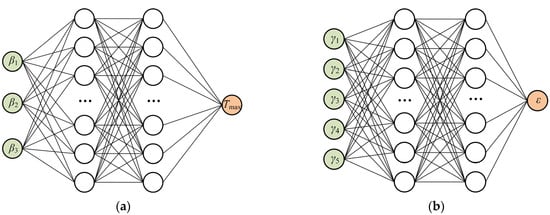 The ANN models in this study are based on the Pytorch implementation. As shown in Figure 4, both the trained thermal ANN and mechanical ANN contain two hidden layers. The activation function between the input and hidden layers is a widely used Tanh function. Since the study is a regression problem, a linear activation function is used between the last hidden layer and the output layer. The loss function L is defined as the average variance of the predicted output value f(x) and the actual output value y. The loss function L is defined as the average variance of the predicted output value f(x) and the actual output value y: