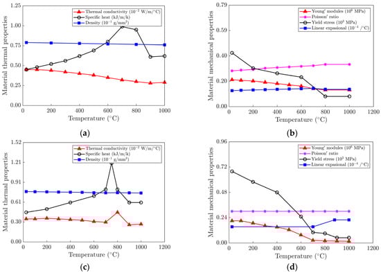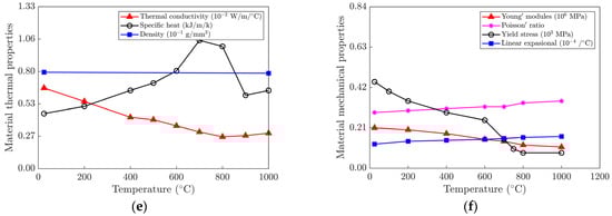 A thermal ANN and a mechanical ANN make up the PIDD model, as explained in Section 3. Here, the thermal ANN and the mechanical ANN are trained first. The materials used for training include Q235, Q345, and EH40. These three materials are widely used in shipbuilding. The thermophysical and mechanical property parameters of the materials are referred to [10,15,16], as shown in Figure 5. In this study, for each material, TEP-FE calculations were performed for three plate thicknesses and a suitable range of machining parameters to obtain the corresponding maximum temperature and plastic strain at the heated surface. Details of the TEP-FEM used are given in reference [10].