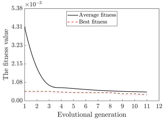 Table 4 summarizes the plate thickness and machining parameters for each material, with a total of 650 samples. Out of the total set of samples, the training set is made up of about 520 and the test set about 130. The genetic algorithm optimizes the hyperparameters of the thermal and mechanical ANNs. Figure 6 displays the population average fitness curves and the best individual curves during evolution. Table 5 displays the optimal hyperparameters of the ANN after about 11 generations of evolution. In Table 5, n1 is the number of neurons in the first hidden layer, n2 is the number of neurons in the second hidden layer, and lr is the initial learning rate. Optimized training takes about 40 min.