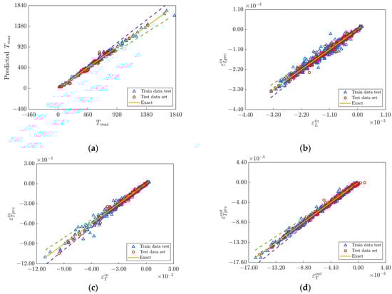 Comparison of the predicted output of the PI-ANN with the TEP-FEM results. The solid line in the figure indicates that the ANN prediction is equal to the TEP-FEM calculation, and the two dashed lines’ ranges indicate that the relative deviation from the calculated value is within ±10%. (a) Thermal ANN prediction of the maximum temperature of the heating surface. (b) Mechanical ANN prediction of longitudinal in-plane strain. (c) Mechanical ANN prediction of transverse in-plane strain. (d) Mechanical ANN prediction of transverse out-of-plane strains.