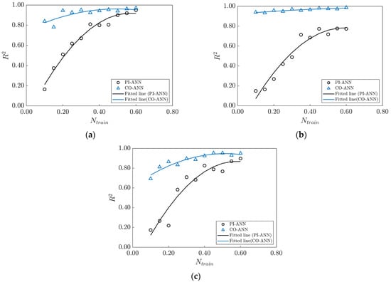 Figure 8 shows the variation of the correlation coefficient R2 with the number of samples for the mechanistic ANN trained by the two methods. In Figure 8, the black dots represent the ANN model trained by the traditional method (CO-ANN), and the blue triangular dots represent the ANN model trained by the proposed method (PI-ANN). It can be seen that the R2 of CO-ANN was around 20% when trained using 10% of the total number of samples, while the R2 of PI-ANN reached more than 80%. Furthermore, although CO-ANN’s R2 shows an increasing trend as the number of samples increased, its growth rate gradually slowed down and never reached the accuracy level of PI-ANN. These results show that the proposed method can effectively alleviate the dependence of model training on the number of samples.