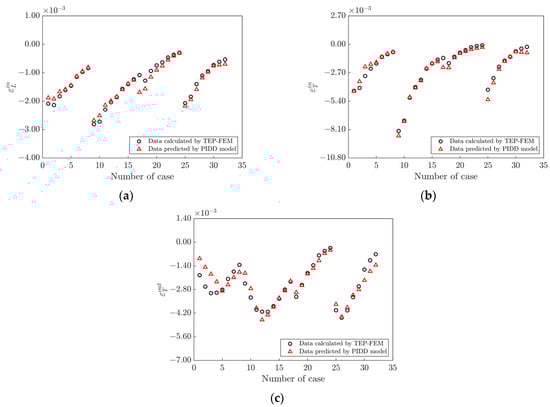 Predicted strain on unseen plate thicknesses. (a) Longitudinal in-plane strain. (b) Transverse in-plane strain. (c) Transverse out-plane strain.