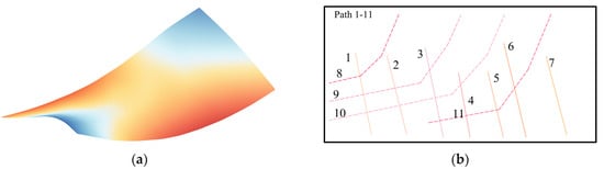Schematic representation of the plate shape and machining path. (a) Plate shape. The darker areas of the graph represent larger z-direction coordinates, with red representing negative values and blue representing positive values. (b) Machining path. The solid line in the figure represents loading on the front side of the board and the dotted line represents loading on the back side of the board.