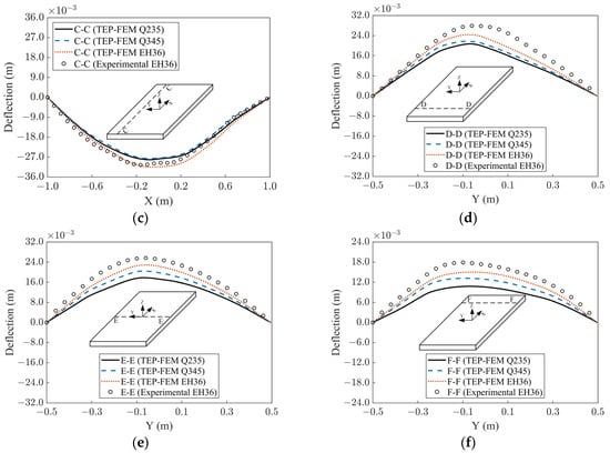 Deflection curves for different materials. (a) Deflection along line A-A. (b) Deflection along line B-B. (c) Deflection along line C-C. (d) Deflection along line D-D. (e) Deflection along line E-E. (f) Deflection along line F-F.