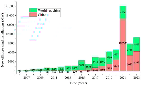 In response to global climate change, the prominence of new green energy sources has significantly increased [,,]. Wind energy, as a key green and clean energy source, has seen substantial development [,,]. Offshore wind power, in particular, offers distinct advantages over onshore wind power []. Recent years have witnessed a dramatic rise in the development of offshore wind power, especially in China []. As of 2023, global offshore wind power installations have reached 75 GW, with China accounting for 50% of this capacity. Figure 1 illustrates the historical development of offshore wind power installations both in China and globally (excluding China) [].