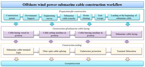 The construction process for offshore wind power submarine cables comprises three main phases: preparation, cable laying, and construction ending. The workflow for offshore wind power submarine cable construction is illustrated in Figure 2.