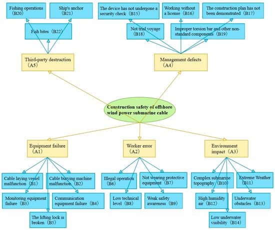 Based on the risk identification results used to develop the AHP model, the safety evaluation model for offshore wind power submarine cable construction is illustrated in Figure 3. This model identifies five first-level risk factors and twenty-two secondary-level risk factors.