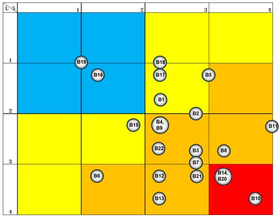 Based on the evaluation results for each secondary-level risk factor, a four-color risk matrix chart was created, as shown in Figure 4. Figure 4 uses a color-coded risk matrix where red indicates major risks, orange denotes significant risks, yellow signifies general risks, and blue represents low risks.
