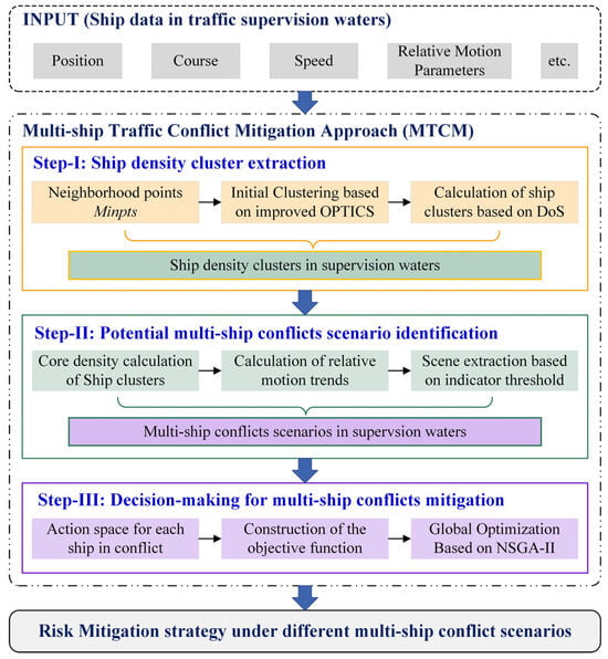 With the continuous improvement of shipping intelligence and ship autonomy, the maritime traffic environment has become more complex. The problem of how to effectively respond to and deal with multi-ship conflicts in offshore and coastal port waters has become an important challenge for maritime traffic supervision. Currently, for maritime traffic conflict situations, maritime operators still use conventional solutions and technical means, that is, they rely more on the operator’s experience and intuition to make risk-mitigation decisions. However, with the increasing complexity of maritime traffic situations, this traditional manual decision-making method will not only increase the workload of regulators, but also lead to decision-making errors or regulatory omissions caused by human factors. In addition, offshore and coastal port waters and other maritime regulatory areas also show the characteristics of ship clustering; that is, ships at sea are not completely disorderly and chaotically sailing in the given waters. Usually, due to the layout of navigation aids or water channels, the traffic flow in the regulatory waters shows a special clustering phenomenon, which makes the hotspots in the regulatory area more obvious, providing feasibility for risk mitigation and supervision of key conflict areas of maritime traffic from a global perspective.