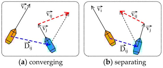 For the discrimination parameter , when , it means that the relative distance between and becomes smaller, and two ships are in a converging state; when , it means that the relative distance between and becomes larger or remains unchanged, and the two ships are in a separating state. The expression of these two relative motion states can be seen in Figure 2. Under the condition of high-density waters, this paper assumes that two ships are forming conflict when they are in a converging state. Therefore, for the ship set , the total number of ships is . If the number of ship pairs with relative motion trend (i.e., , the converging state) is , the parameter can be expressed as Formula (9). This formula means the proportion of ship pairs with relative motion to the total number of ship pairs.