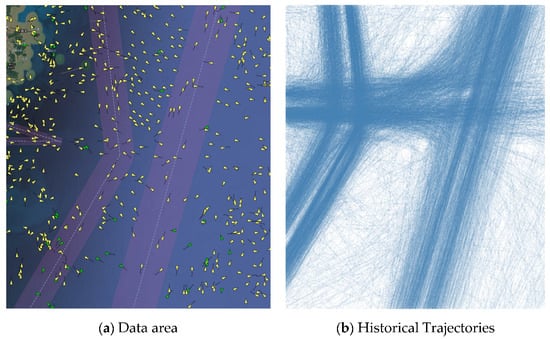 In order to verify the MTCM model proposed in this paper, this paper conducted tests based on AIS data in the southeastern coastal area of China. The location description of this area and the AIS data in this area are shown in Figure 3a and the trajectories of all ships in this area within a period of one month are shown in Figure 3b. The specific area selected in this paper is located off the coast of Ningbo Port, China. It belongs to the offshore area outside the port and is one of the important regulatory areas of the maritime authorities. There are multiple dense traffic flows in this area, including inbound and outbound routes and the busiest north-south routes on the southeast coast. In addition to ships on the main routes, there are also other ships in this water, such as irregularly sailing fishing vessels. Such a complex maritime traffic environment often leads to typical multi-ship conflict situations, which brings many challenges to maritime traffic supervision.