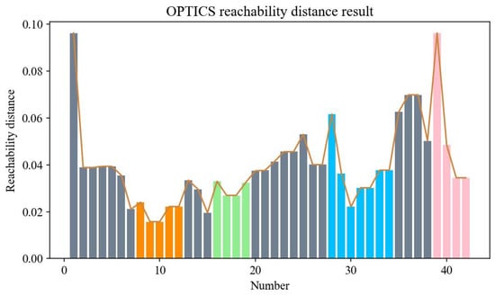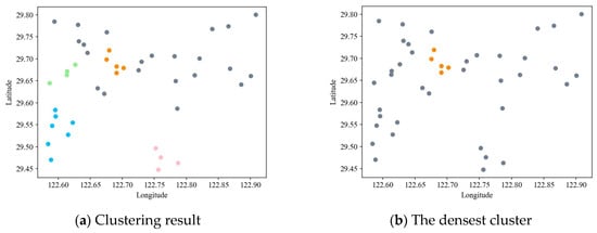 This paper selected AIS data of some areas in this water at a certain moment (including 42 ships in total) to verify the model proposed in this paper. According to the MTCM processing flow, we set the equal to 4, and the slope threshold equal to 5%. The ship density clustering result after OPTICS processing is shown in Figure 4a. The ships are divided into 4 clusters and marked with different colors (pink-0, green-1, blue-2, and orange-3). The remaining ships that are not classified into any category (such as gray points in the figure) are regarded as noise points. Among these four categories, the densest cluster (i.e., the one with the largest average core density) according to the definition of the OPTICS algorithm is “Orange-3”, as shown in Figure 4b. During the clustering process, the statistical results of the reachable distance calculation of different ship points are shown in Figure 5. It is necessary to explain here that the reachable distance in Figure 5 is an indicator of the distance between ships calculated based on multiple ship coordinates. This indicator is only used to reflect the distance relationship between ships and does not have a practical distance unit.