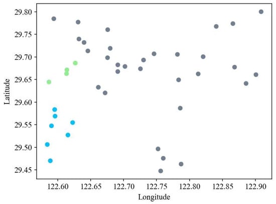 In contrast to the DBSCAN algorithm, OPTICS does not produce clusters of clustering results, but instead generates an augmented cluster ranking for cluster analysis. Under this sorting, each object contains two pieces of information: core distance and reachable distance. For ships in the regulated sea area at a certain moment, the ship point set can be obtained based on its position information. Assume that the neighborhood radius is , and the minimum number of ships in the neighborhood is . Then for any ship belonging to the set , its neighborhood can be expressed as:
