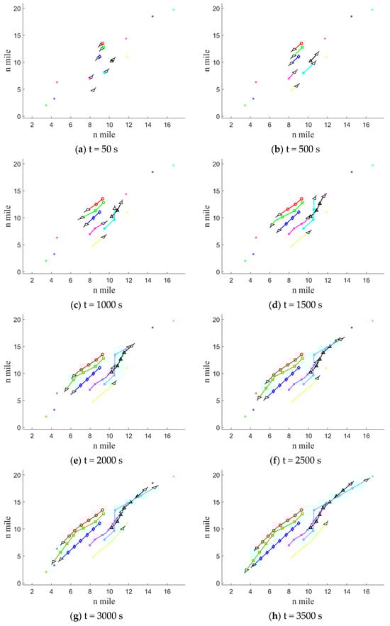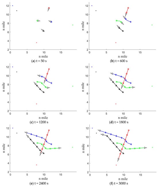 According to the mitigation strategy of each multi-ship conflict scenario, this paper verifies the effectiveness and rationality of the strategy in a simulation environment. In the specific simulation process, this paper sets the starting position of each ship at the position coordinates in Table 2 and Table 3, which are 600 s forward, and the end position is set at the position coordinates 3000 s backward. After all ships reach the position coordinates, the mitigation strategy set in Formula (20) is triggered.