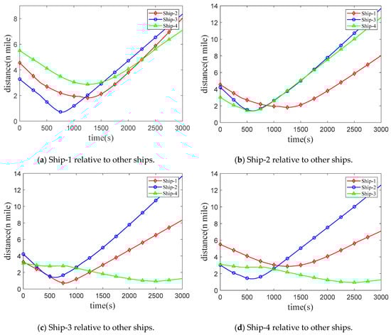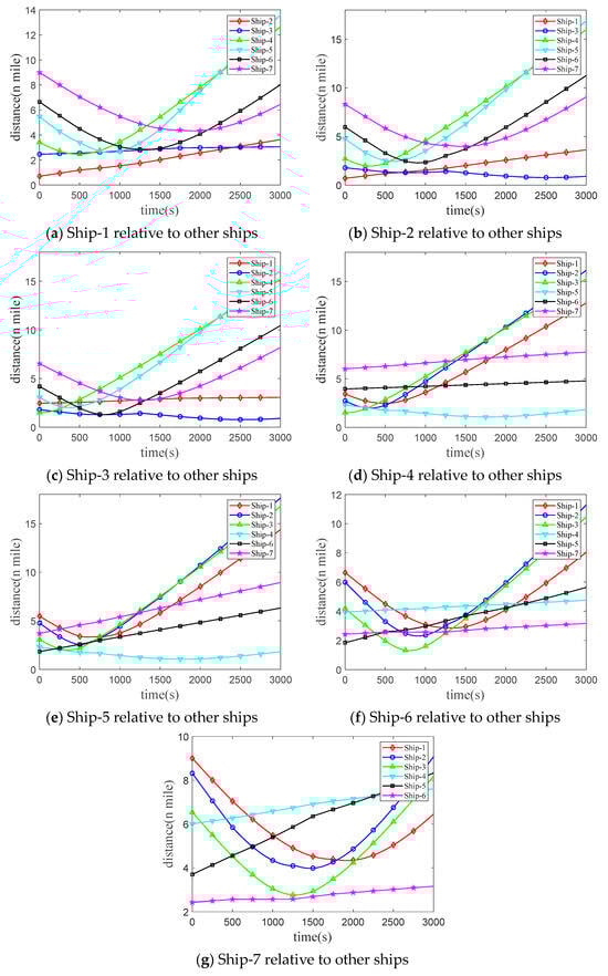 For conflict scenario ID-1, the conflict mitigation process is shown in Figure 7, and 6 moments are selected in chronological order. During the risk mitigation process, the relative distance change record between the ships is shown in Figure 8. According to the relative distance change, it can be seen that the conflict mitigation strategy can effectively ensure that each ship safely passes through the conflict risk area. Similarly, for conflict scenario ID-2, the conflict mitigation process and results can be seen in Figure 9, and the relative distance change record between ships can be referred to Figure 10. There are 7 ships in scene ID-2, which can be roughly divided into left and right sides according to their location distribution, that is, three ships sailing downward and four ships sailing upward. However, due to the excessive density of ships at different speeds, there are obvious ship navigation conflicts in this area. The conflict mitigation strategies generated by the model in this paper can effectively handle the ship navigation conflicts in this situation and ensure that each ship passes safely.