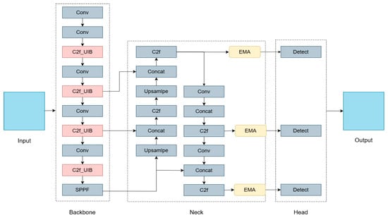 - Model Optimization: The BottleNeck component of the C2f module is replaced with the UIB module as the primary gradient flow branch. This new combined module substitutes the C2f module in the original model’s backbone network, resulting in an 80% reduction in model parameters and achieving lightweight processing. Additionally, the incorporation of the EMA mechanism enhances the model’s feature processing performance and improves detection accuracy.