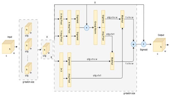 This approach primarily reduces computational overhead by reshaping certain channels into the batch dimension and grouping the channel dimension into multiple sub-features. By encoding global information, the channel weights in each parallel branch are recalibrated. The pixel-level relationships are then captured through cross-channel interaction, which enhances the model’s feature representation capabilities.