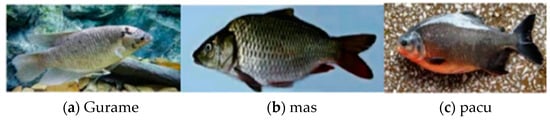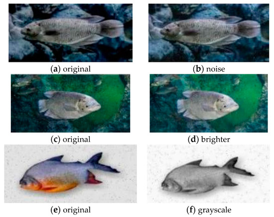 The data set used in this study is taken from the Roboflow Universe data set library, which contains three kinds of fish pictures—Gurame; goldfish (mas); and baku fish (pacu). In order to simulate the complex underwater shooting environment, each image is randomly processed and expanded by using grayscale, adding noise, brightness adjustment, and other methods. The number of images in the data set is 5172. The image size is unified to 640 × 640. Some of the data are shown in Figure 6, and the comparison before and after data processing is shown in Figure 7.