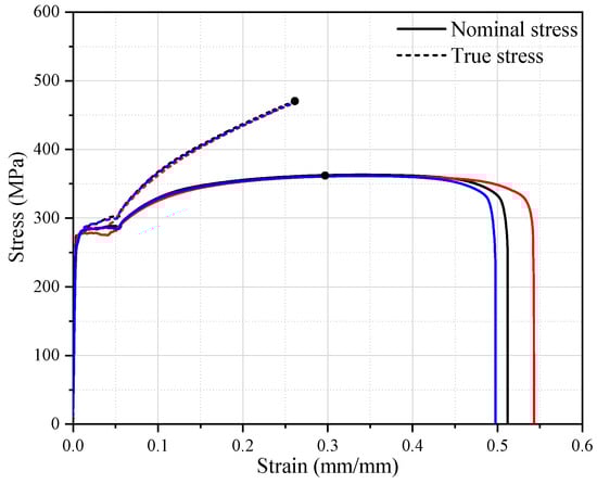 In this study, the test specimen was made of mild steel with dimensions of 0.35 × 0.35 × 0.001 m, where the effective dimensions were 0.25 × 0.25 × 0.001 m. Uniaxial tensile tests of the steel plates were carried out on a universal testing machine, and the tests were repeated three times to check the accuracy. The tensile stress–strain curves obtained in the three tests are shown by three colors in Figure 3. The nominal stress was obtained by the tensile force divided by the original cross-sectional area of the tensile specimen, and the corresponding nominal strain was the result of dividing the tensile elongation by the original length of the tensile specimen. The true stress and true strain were calculated by the following equations: