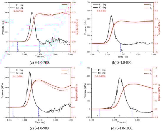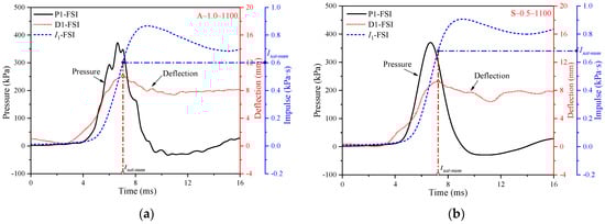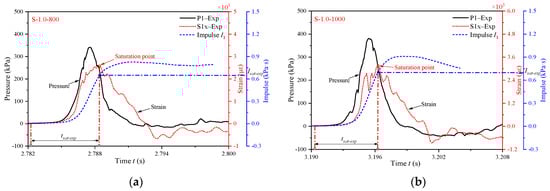 Figure 11a,b display the comparison of the measured plastic response and pressure pulse for drop heights of 800 mm and 1000 mm, in which the variations in the integral impulse are also drawn. It should be noted that the directly measured strain variations at the plate center were employed instead of the deflection–time histories for the saturated impulse analysis. In each figure, the curves of the slamming pressure, strain, and calculated impulse are marked in different colors. To clearly show the comparison, only a time period of 0.018 s of the test results is depicted in the figures. As shown in the figures, the plates gained their maximum central strain at a time instant later than the occurrence of the peak pressure, which implies that the saturation phenomenon also existed for the 1.0 mm steel plates under a slamming impact. The time point of peak strain is defined as the saturation point, and the corresponding impulse is defined as the saturated impulse Isat-exp.