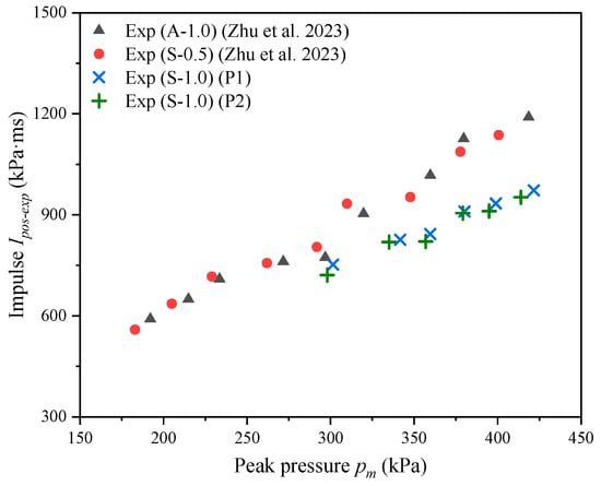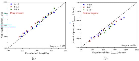 Figure 17a,b present the comparison of the experimental data with the numerically predicted peak pressure and the integral impulse Ipos of the first positive pulse, respectively. The dashed line indicates an identical match. It is noted that only the pressure pulse at central point P1 was used for the analysis, as the slamming pressure was uniformly distributed on the plate. As shown in the figures, the peak pressures and impulses predicted by the numerical model were in reasonable agreement with the test results. In addition, it was observed that the numerical predictions slightly overpredicted the peak pressures while underestimating the positive impulses. This difference between the numerical predictions and the test results was possibly caused by the modeling of the effects of the air cushion and air–water–structure interaction, as well as the simplified boundary condition.