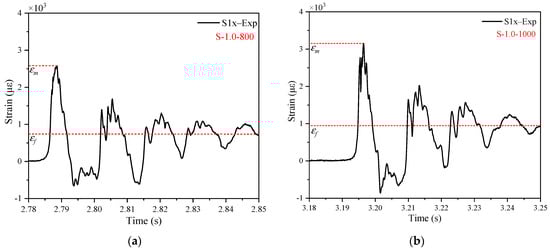The central strain-time history of the flat steel plates with the drop heights of (a) 800 mm and (b) 1000 mm.