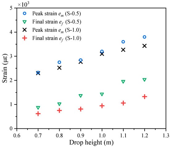 Figure 7 plots the test results of the strain–time histories at the flat plate center (S1) under the drop heights of 800 mm and 1000 mm, and a time duration of 0.08 s was chosen to clearly show the strain curves. It is noted that the yield strain ey of the steel plate was approximately the ratio of the yield stress to Young’s modulus. It was found that the peak strains at the plate center with the drop height of 0.8 m and 1.0 m were 2580 and 3156 microstrains, respectively, which were 1.9 and 2.4 times the yield strain. As shown in the figures, a wide “valley” was found in the strain curves after the peak values, which may have been due to the effect of hydroelasticity. For the central strain response of the plate, only the values of the final strain ef and the peak strain em are typically considered, with the final strain being averaged over the fluctuating strains during the later phase of the response dominated by the structural elastic vibration. Figure 8 depicts the results of the final and peak strains under various drop heights, where the strain data for 0.5 mm steel plates in ref. [12] was also included for comparison. The results show that the final and peak strains increased almost linearly with the drop height. In addition, the final strain values of the 1.0 mm steel plates were obviously smaller than those of the 0.5 mm steel plates, but the peak strains of the 1.0 mm steel plates were slightly smaller than the results for the 0.5 mm steel plate, which may have been related to the deformation mode of the plate during slamming.