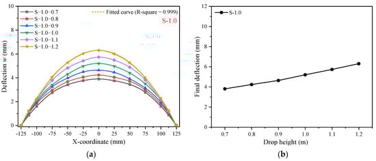 (a) The transverse deformation profiles measured along the X-axis, and (b) the final central deflection of flat steel plates against the drop height.